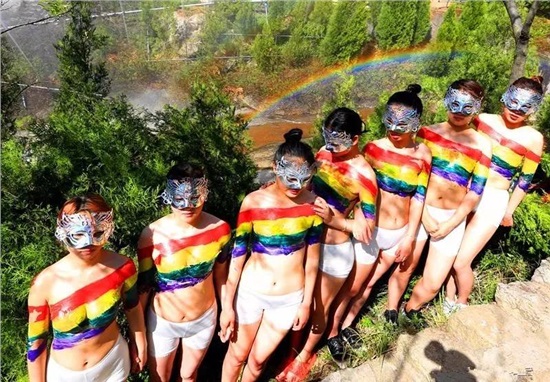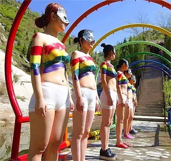 此次娘娘山景区突破以往传统的宣传模式,由专业的彩绘师在裸露上半身的美女身上手绘彩虹,在景区内一些彩虹特别明显的地点,与真正的彩虹形成了一幅美丽的画卷。只见这七位美女,身披彩虹,以真正的彩虹为背景,留下了精彩的片刻,特别惹人注目。
