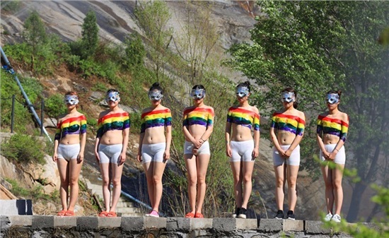 当人体彩绘彩虹撞上了唯美彩虹后,人与景相得益彰,颇有一番风情在其中。而这一壮举,就在4月22日,在河南省灵宝市娘娘山彩虹谷内,七名女子以人体彩绘的形式,组成一幅唯美的彩虹图案,向空中的彩虹致敬,与空中的彩虹比美。