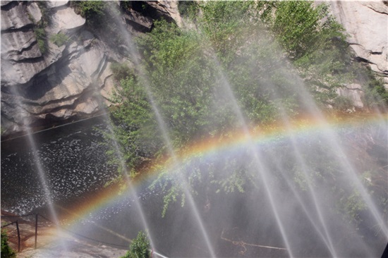 体力较好者可继续登山游览石屋、狼穴、一线天、通帝座到达景区最高峰娘娘庙,之后返到一线天三岔路口,走右手边继续欣赏神龟石、娘娘脚印五子石、和尚帽等景观至凤凰岭停车场,乘坐观光车(20元/人,费用自理)抵达景区停车场,或从彩虹谷原路返回。